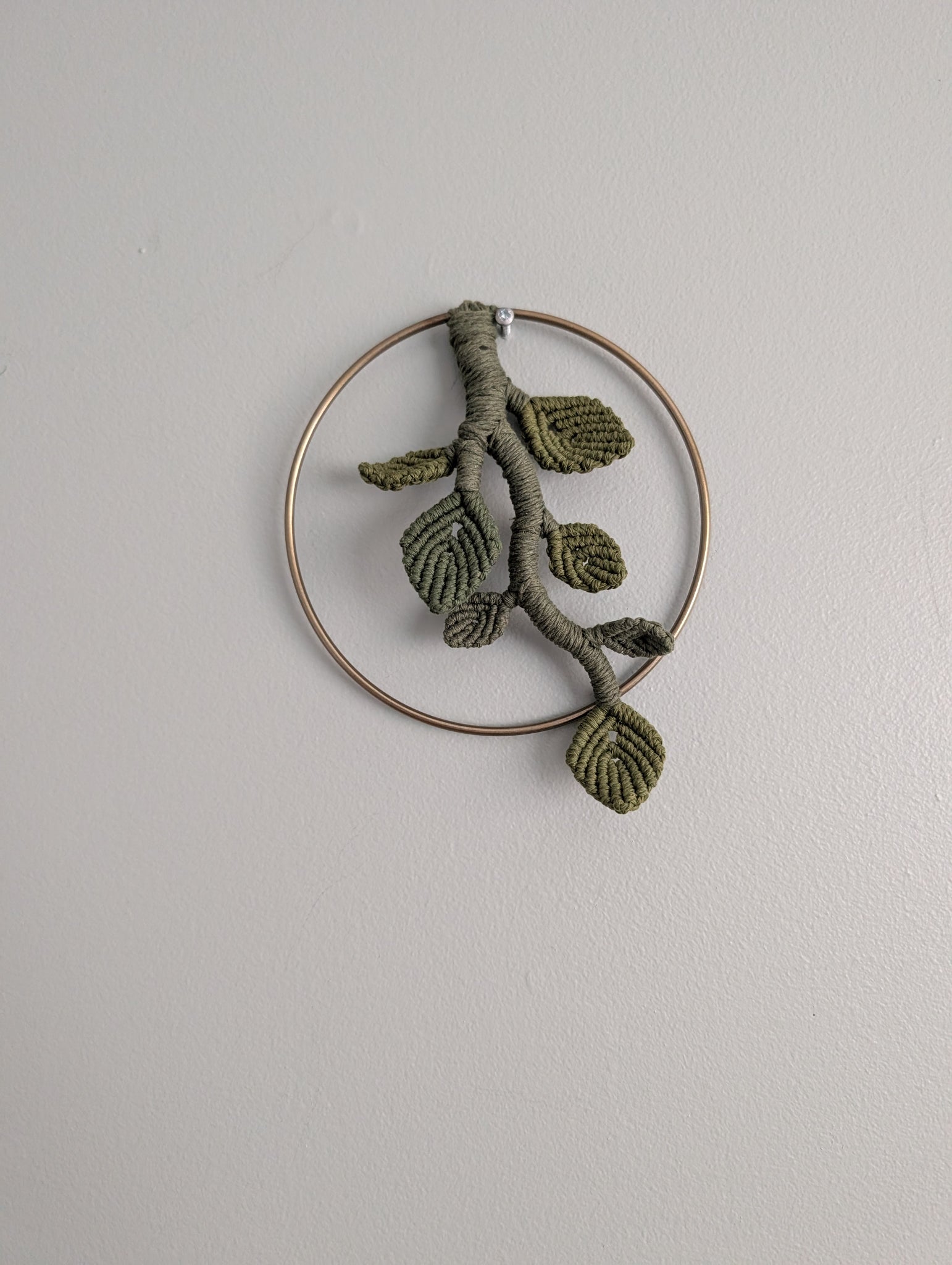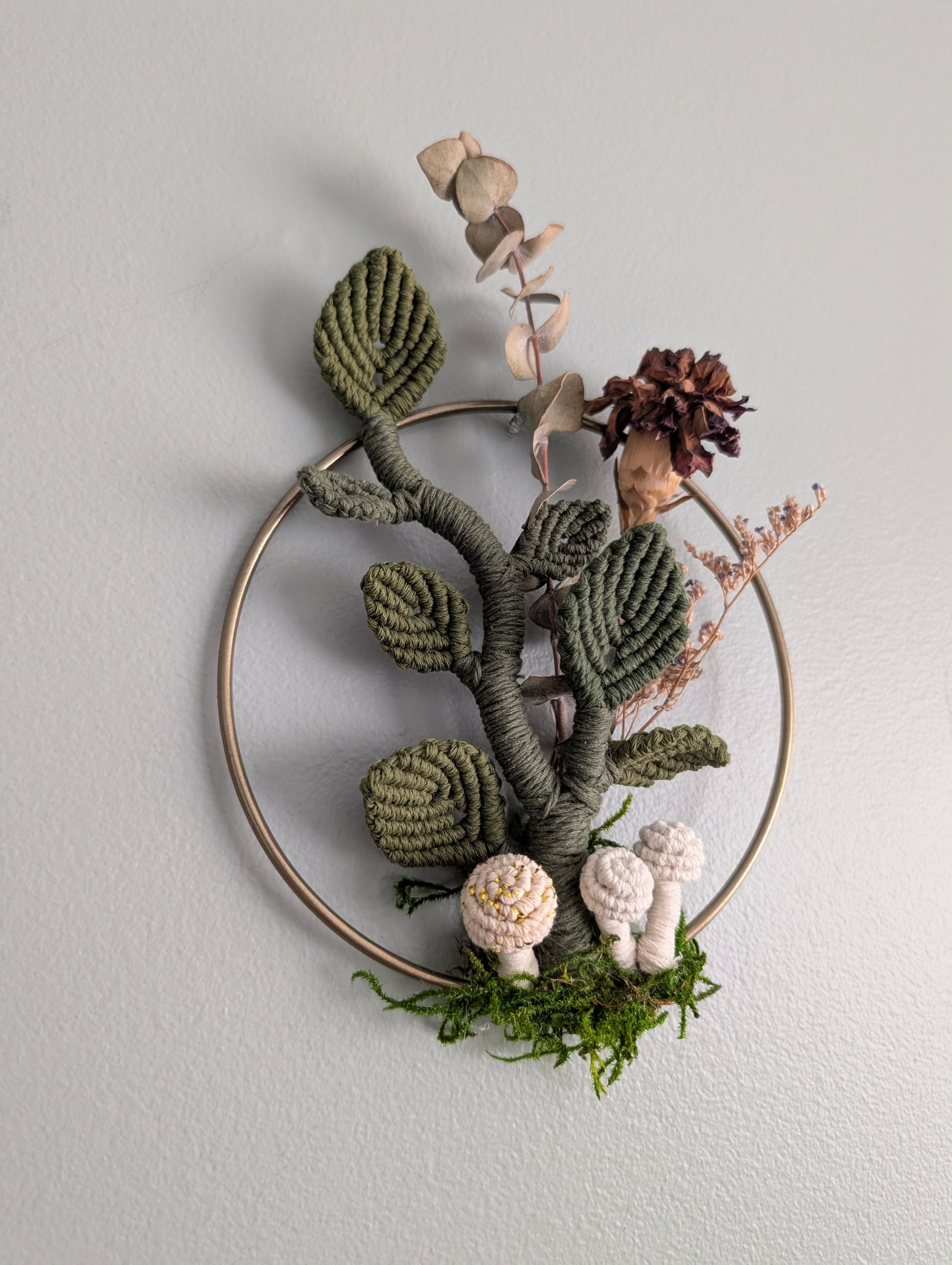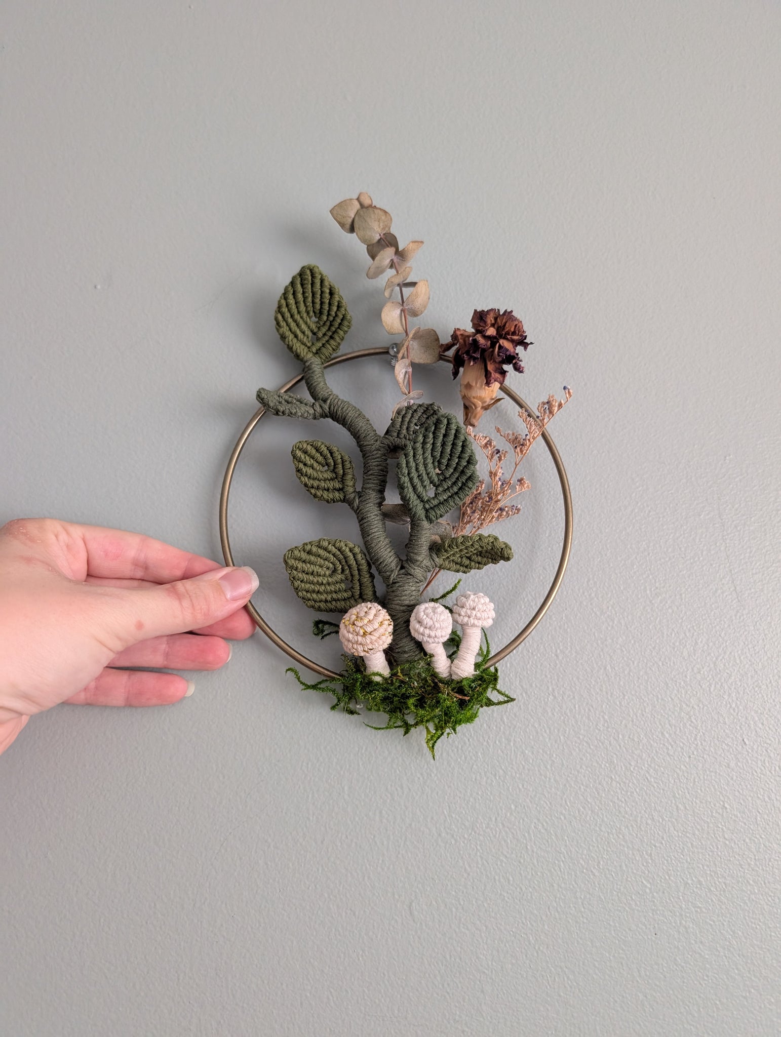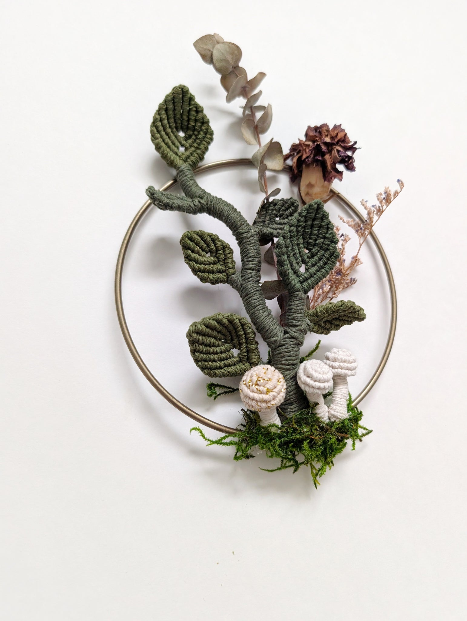 Mini macrame wall hanging on a geometric brass powder-coated frame featuring a three-dimensional leaves and vines sculpture. Choose to add 3D mushrooms or real dried flowrs. This one-of-a-kind wall hanging adds a natural and organic design element to your home.
