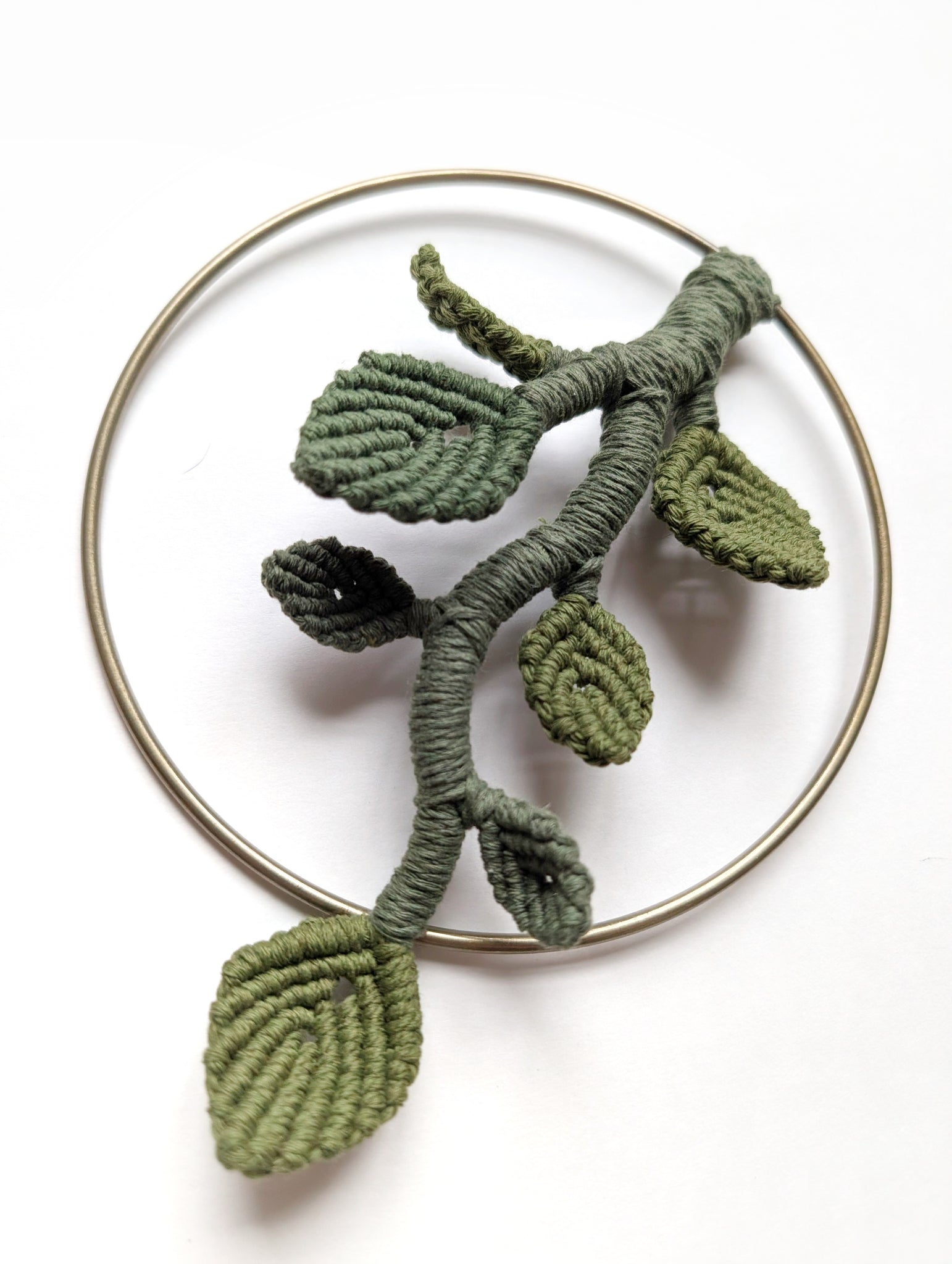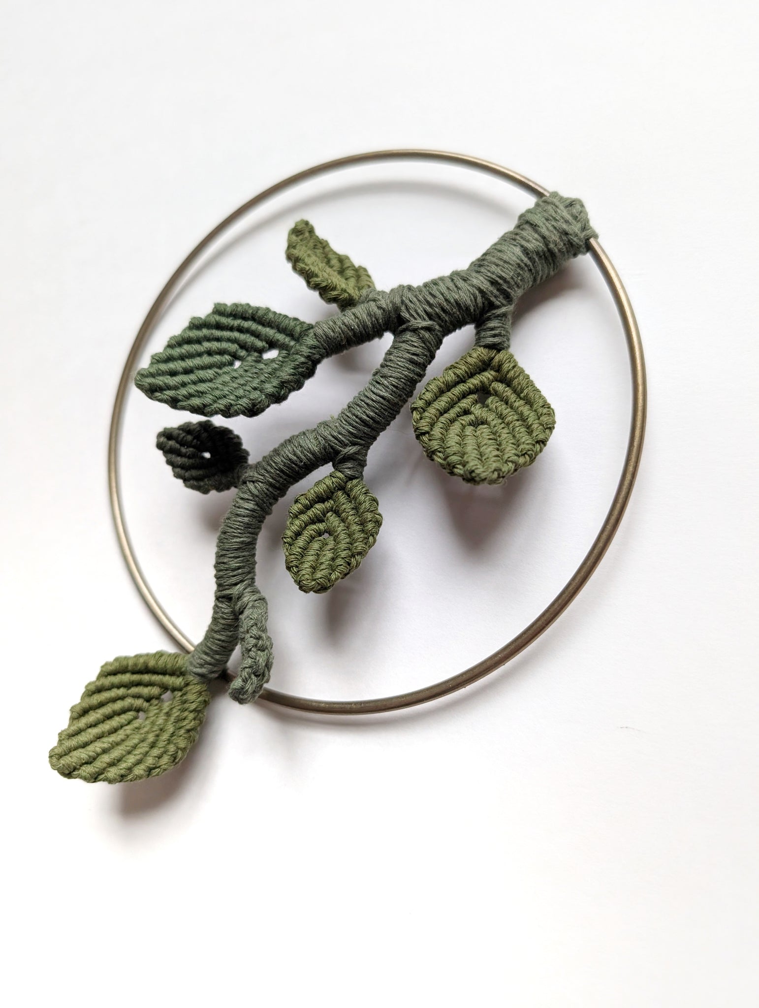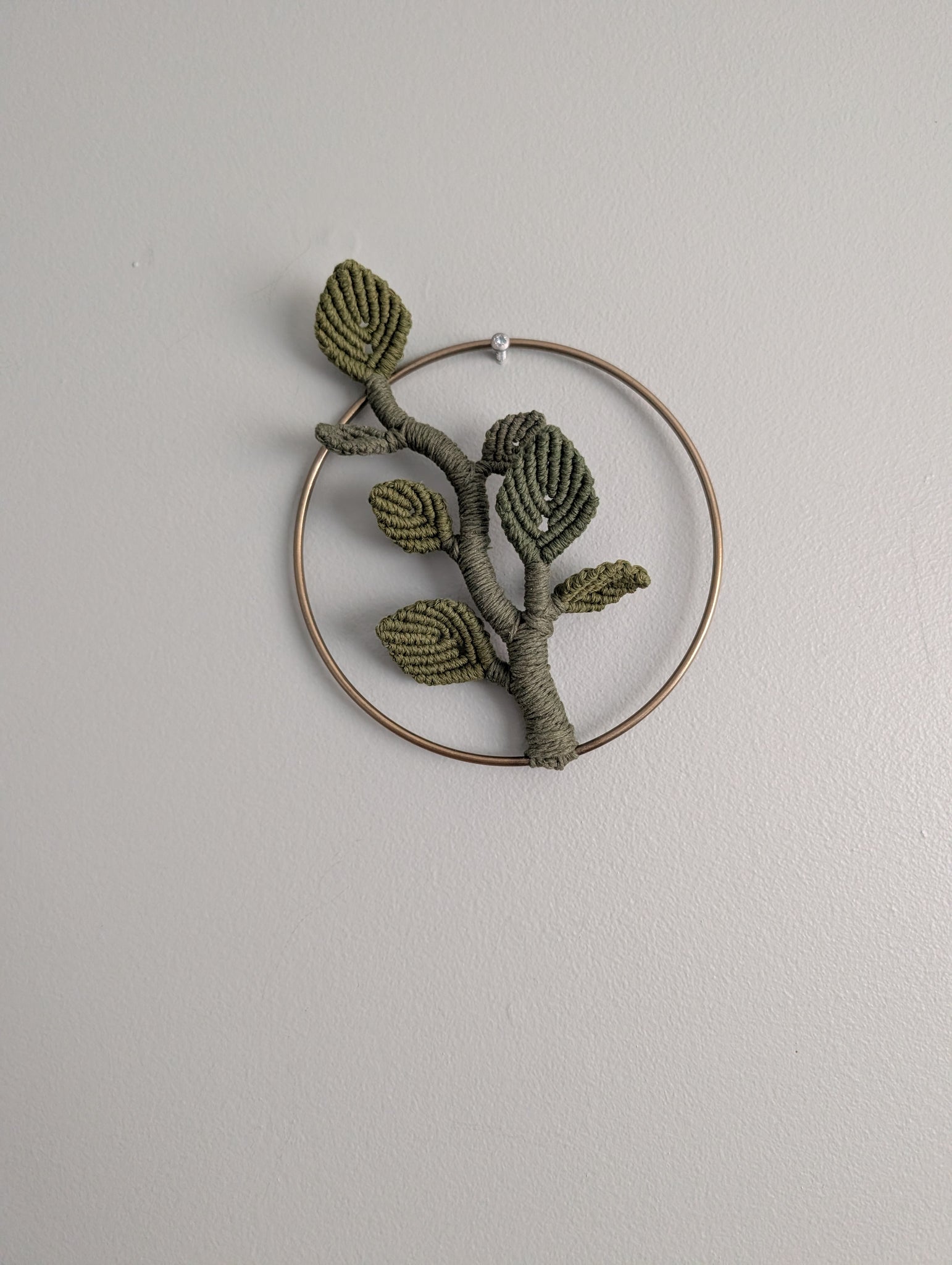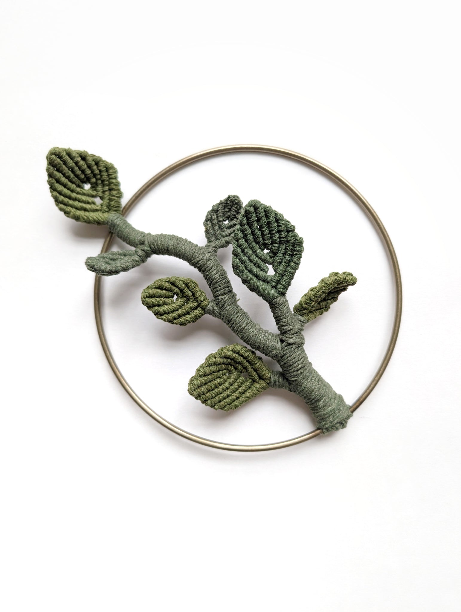 Mini macrame wall hanging on a geometric brass powder-coated frame featuring a three-dimensional leaves and vines sculpture. Choose to add 3D mushrooms or real dried flowrs. This one-of-a-kind wall hanging adds a natural and organic design element to your home.